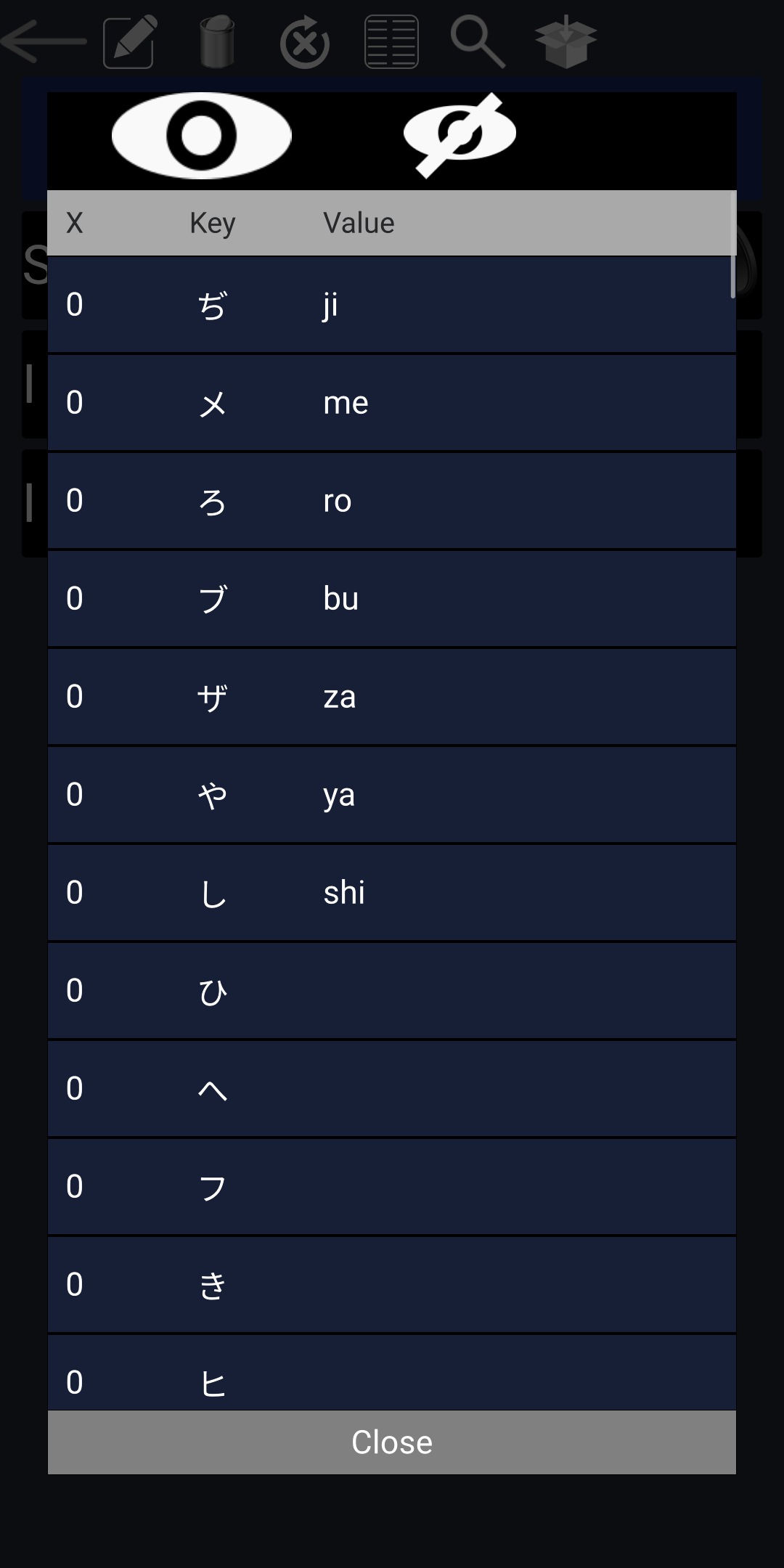 List of problem set you are solving now. Use show/hide button to toggle show/hide key/value. In hide mode, you can toggle show/hide each item by clicking it. If you press and hold the item, the edit dialog pops up. 'X' in the left column indicates the number of times you got wrong. If this number is higher, you fotget it more easily.